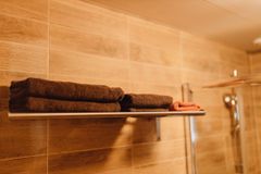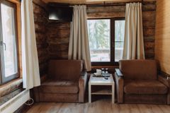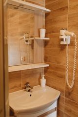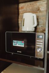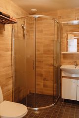 Вход в каждую комнату с улицы. В комнате две кровати и два раскладных кресла-кровати, которые могут быть использовы в качестве дополнительных спальных мест. Холодильник, чайник, микроволновая печь. Туалетная комната с подогревом пола, душевая кабина, унитаз, умывальник, зеркало, фен, цифровое ТV, беспроводной интернет WI-FI. У каждого номера есть терраса с мебелью. Площадь комнаты 30 м2.