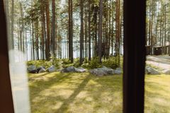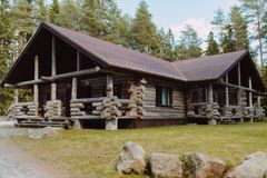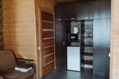 Вход в часть коттеджа с улицы. Просторная гостиная с кухонным гарнитуром, мягкий двухместный диван, журнальный столик, посуда, электрочайник, микроволновая печь, двухконфорочная электроплита, стиральная машина, холодильник, спутниковое TV (Триколор). Две спальни, просторная терраса с мебелью для отдыха и видом на озеро. Площадь части коттеджа 55 м2. Вместимость — 4 основных и 2 дополнительных места.